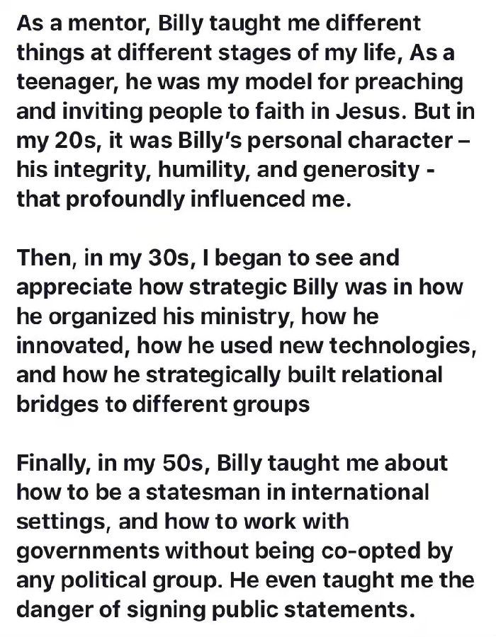 他说:“在我人生的不同年龄阶段,葛培理牧师作为我的导师、好朋友,教了我不同的事情。我十多岁时,他是我的榜样,传扬福音,引人归主;我二十岁时,他的人格、谦卑、大度,深深地影响了我;我三十多岁时,他的组织能力、创新能力、应用高科技、外交协调能力,让我大受裨益;我五十多岁时,他又教了我如何处理政治、国际事务,又不至于受牵制。他甚至教了我如何谨慎签署公开声明。”