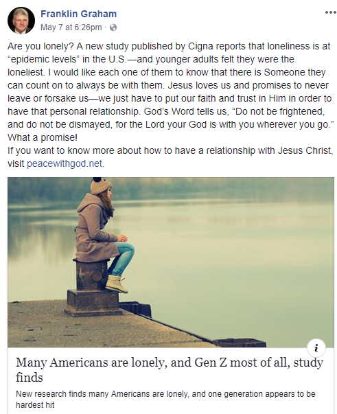 就此问题,葛培理布道团的主席葛福临也在脸书上提到,美国的孤独感如同“流行病”一样普遍,很多年轻人都认为他们是最孤独的。“我希望他们中的每一个人都知道,有一位他们可以随时依靠的永远和他们在一起。”葛福临说:“耶稣爱我们,承诺永不离开或抛弃我们,我们必须把我们的信仰和信任放在他身上,以便拥有这种个人关系。”