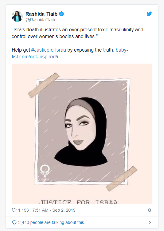 美国众议员特兰波(Rashida Tlaib)也是一名美籍巴勒斯坦裔国会女议员,她也用这个标签来呼吁对伊斯拉讨回公道。以下是她网上发布两条信息: