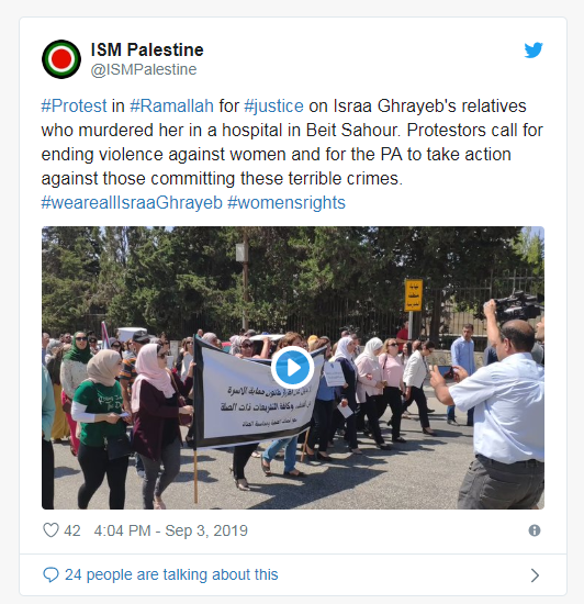 穆斯林男女活动家在网上说,荣誉杀人是极其严重的问题,并鼓励其他人大声疾呼并勇于公开反对这种做法。与此同时,拉马拉的抗议者敦促巴勒斯坦官员对杀害伊斯拉的凶手嫌疑人绳之于法。