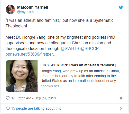 “我曾是无神论者和女权主义者,”而现在的她是一个系统的神学家!杨洪毅博士是我所认识最聪明、最虔诚的博士生导师之一,通过美西南浸信会神学院(SWBTS)和美南浸信会社区改变项目(SBCCP),我们现在是基督教布道和神学教育的同事。-马尔科姆 ·亚尔耐尔(Malcolm Yarnell) 2019年9月23日