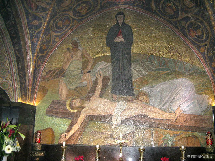 圣墓大殿的一幅画展现了耶稣被钉在十字架上的场景。被脱了衣服的耶稣平躺在十字架上,兵士们用大铁钉穿透耶稣的双手和双脚,这是一种肉体被撕裂的极大的痛苦。
