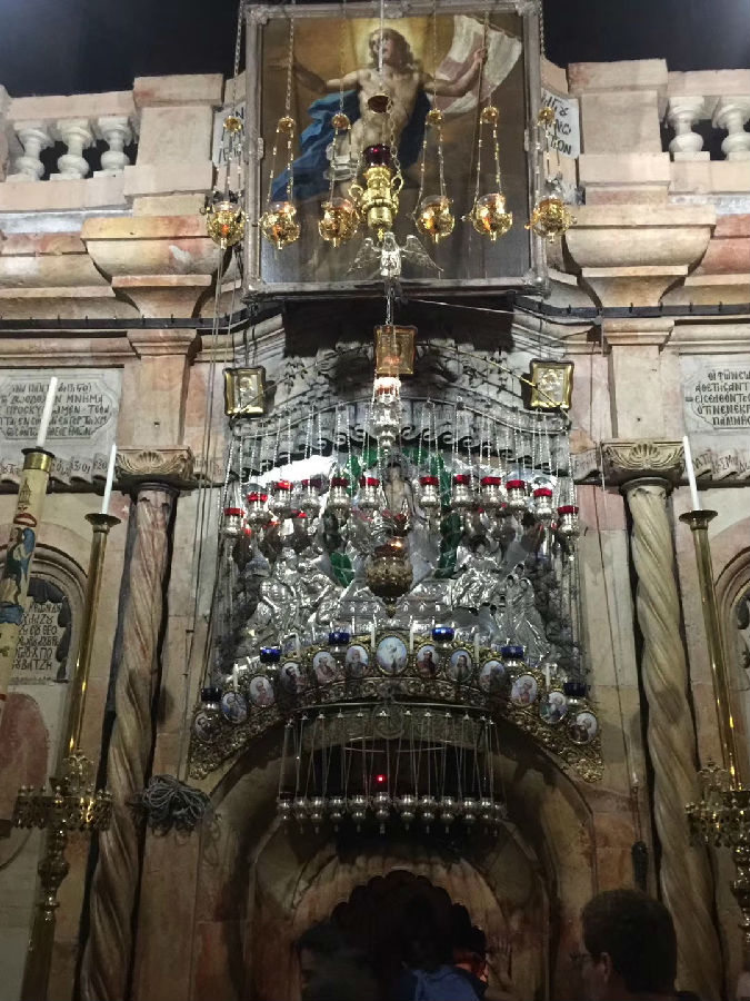 在曾经耶稣被短暂安葬的地方,也就是今天圣墓大殿里面再建了一个小教堂来纪念,入口处非常小,只可以允许一个人弯腰进入,里面的空间也尽可以容纳几人,这里每天都有成千上万的人排队进去,希望一睹当年耶稣安葬时躺在上面的大理石。