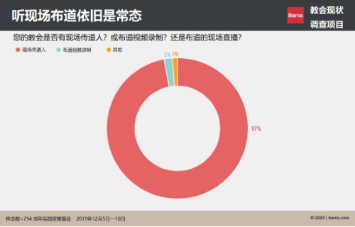 几十年来,人们对现场直播或卫星服务越来越感兴趣。教会通常是在超大型布道或多堂点聚会中,会众们会依靠视频传输,有时甚至是全息图像让会众听讲员讲道。然而,尽管围绕这些高科技布道的呼声越来越多,但运用高科技手段布道的现象并不多。巴尔纳的新数据表明,运用高科技服侍仍然是一种新鲜事物。极少数(只有2%的实践型基督徒)说他们参加的教会使用视频或直播布道,绝大多数(97%)的教会仍然是采用现场布道的方式参加聚会。虽然大教会的受访者(200多人)比小教会的人表示更有可能采用线上布道,但总体而言,参与者群体仍然太少,并不具有统计意义。
