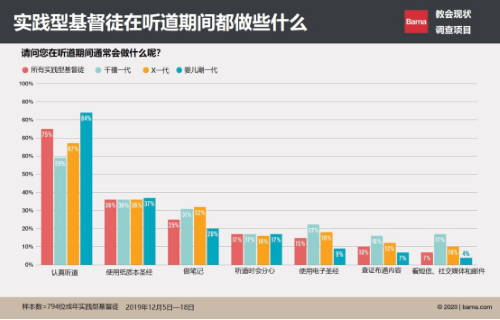 婴儿潮一代比X世代和千禧一代更有可能表示他们在布道期间认真听道,但所有人都同样报告在礼拜期间分心。对于更加依赖电子设备的年轻一代来说,在教堂里手持智能手机或平板电脑可能是很正常的一件事,这是帮助或影响他们参与礼拜的另一个机会。同样,对于年长的基督徒来说,螺旋装订的笔记本可能是他们在听道期间的必需品,用来记笔记或在页边空白处涂鸦。事实上,婴儿潮一代在礼拜期间做笔记的可能性低于年轻一代。
