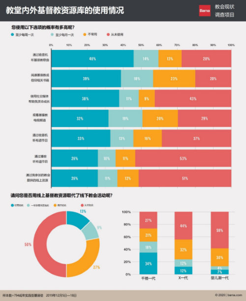 这种基督教资讯在不同媒介和人们的时间安排上的分布是值得庆祝的,这既是基督教教导的独创性,也是基督教教导无处不在的标志。但是,教会领袖们可能会惊讶地发现,这些资源被依赖于替代面对面参与礼拜场所的频率有多高。在所有获取信仰相关资源的信徒中,有一半的信徒表示,他们至少偶尔会 "依靠线上基督教媒介来代替亲自去教堂"(13%的人经常这样做,9%的人常常是这样,27%的人偶尔这样做)。