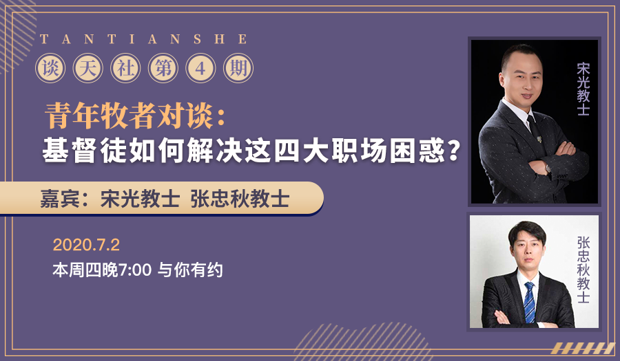 弟兄姐妹们,对于工作,您是否有未解开的困惑,导致您在工作中迟疑不定、无的放矢?谈天社第四期2020年7月2日 邀请了两位对职场牧养有负担的青年牧者——宋光教士与张忠秋传道,对这四个问题进行了解答。
