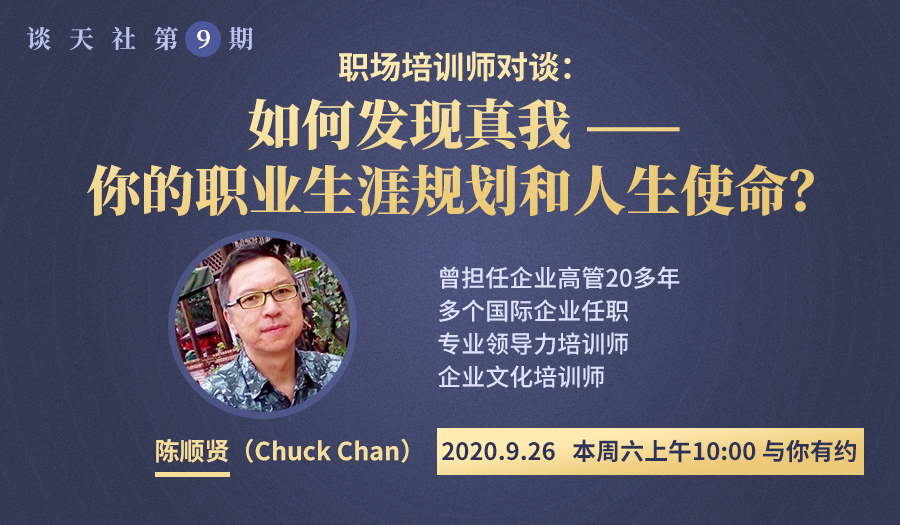 在9月26日举行的“谈天社”第9期中,曾有担任企业高管20多年经验的专业领导力培训师陈顺贤作为嘉宾就“如何发现真我——你的职业生涯规划和人生使命?”话题进行分享,反复强调说,“使命”是我们职场和人生中的无形财富,如果我们想过一个精彩的人生,清晰使命是不可缺少的。