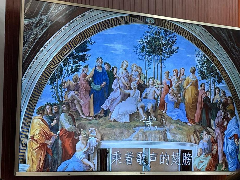在讲座中,姜林静教授首先介绍了为什么要把两种艺术形式——文学与音乐——结合来讲,而不是单单从文学或者音乐角度。她借助拉斐尔著名湿壁画《帕那苏斯山》(The Parnassus)来进行阐述:画中央是戴着月桂冠、手拿里拉琴的阿波罗,旁边环绕着九位缪斯女神、九位古代诗人以及九位当代诗人。阿波罗作为音乐家和诗人的保护神,手中的里拉琴代表诗歌与音乐的结合体。里拉琴的英文单词是lyre,是英文单词lyric抒情诗的词源。抒情诗lyric本身包含诗歌咏唱的艺术,古代的诗歌并不是印刷在本子供人阅读,而是需要被咏唱出来,咏唱和文字本身融合在一起。