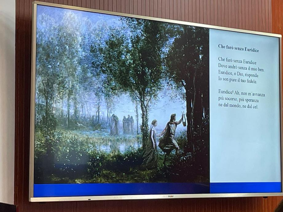 俄耳甫斯的经典悲情故事改编成了诸多音乐剧,也深刻影响很多艺术家与音乐家。姜教授现场播放了18世纪德国作曲家格鲁克的意大利作品《奥菲欧与欧律狄斯》(Orfeo edEuridice),演员的神情和歌唱情感中散发出阵阵哀伤,旋律上却让人赏心悦目与心醉神迷。