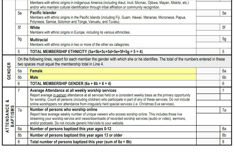 目前联合卫理公会统计表格要求牧师统计男性和女性成员的人数,之后给出两者的总人数。但这些性别分类让部分成员感觉没有被计算在内。
