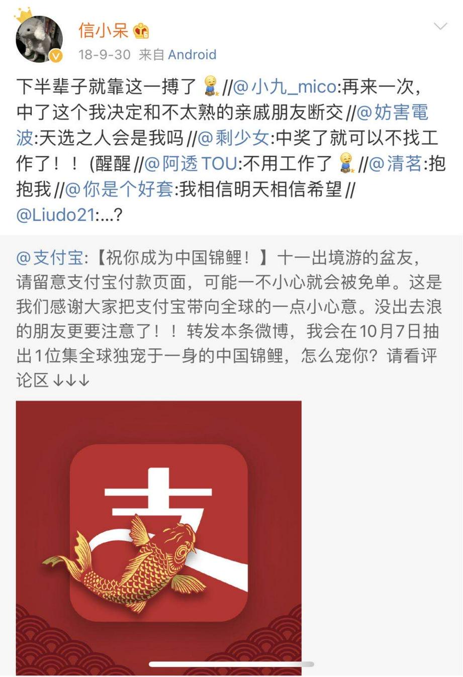 不知道大家是否还记得信小呆,她就是那个在2018年“中国锦鲤全球免单大礼包”抽奖活动的中奖幸运儿。