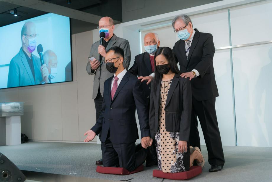 陈牧师分享结束后,进入了按手仪式。由灵粮全球使徒性网络主席周神助牧师、前中华基督教长老会台北信友堂主任牧师沈正牧师和中华福音神学院院长戴继宗牧师为董牧师夫妇进行按手,并由戴继宗牧师做祝福的祷告。