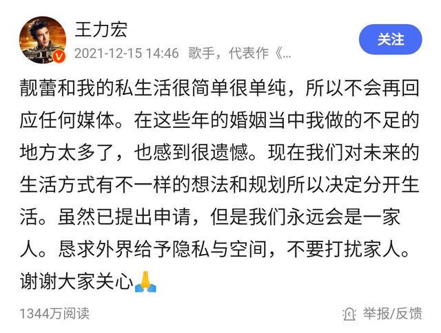 12月15日下午,王力宏通过个人微博发声回应了此前的离婚传闻。以下为微博正文: