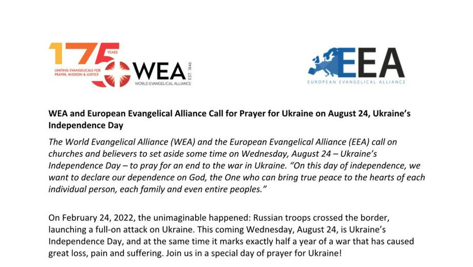 世界福音联盟及欧洲福音联盟呼吁教会及信徒在8月24日星期三,即乌克兰独立日,抽出一段时间,为乌克兰战争的结束祈祷。