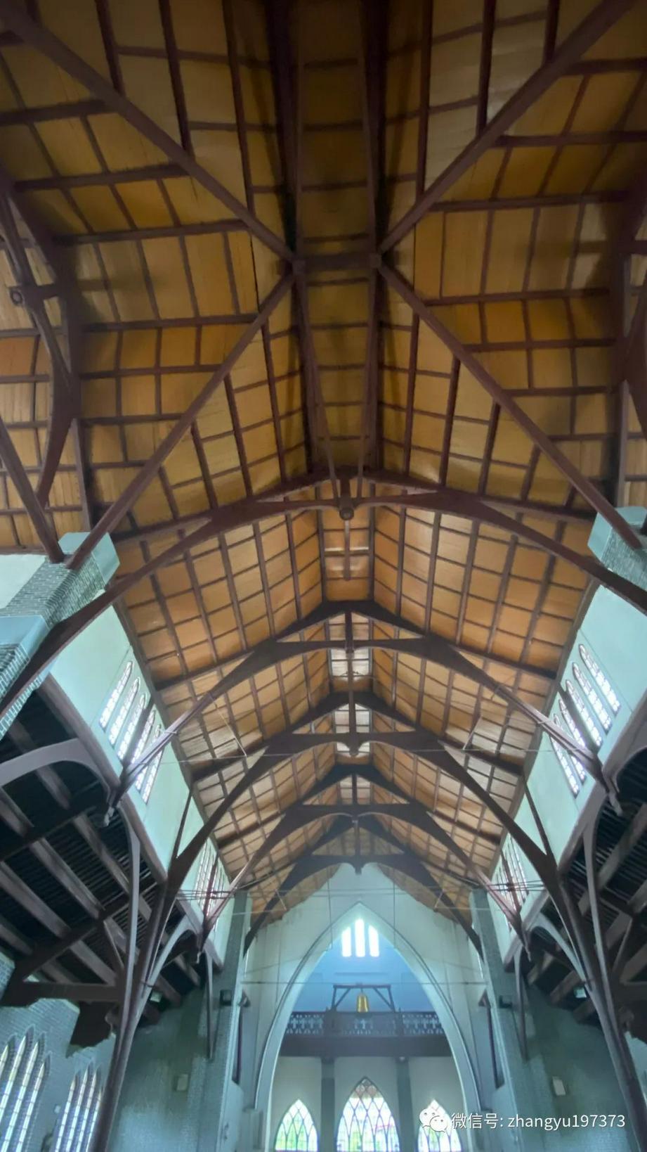 圣约翰大教堂由澳大利亚建筑师饶哲夫设计,占地近50亩,建筑面积超过2000平方米,可以容纳近2000名信徒。整体建筑具有哥特风格的崇高感,亦有东方元素穿插其中。从空中俯瞰,外形是一个巨大的十字架。内部空间设计,按“圣殿、圣所、至圣所”布局,“至圣所”墙面上是巨大的圣公会风格十字架,圣公会风格的十字架保留了古典元素,与众多新教的十字架风格有明显不同。至圣所墙壁两侧镶嵌着《十诫》碑文,紧挨着的“圣所”墙壁上镶嵌着《信经》和《主祷文》的碑文。四块碑文刻在很好的石材上,使用的是深文理白话译本,较之目前通用的和合本译本更为简洁明快。屋顶的设计很有骨骼感,弧形梁木层层升高架空,一层一层纵向延伸,有点诺亚方舟的感觉。屋顶的横梁设计别出心裁,使用了钢索链接,这很罕见,通常我们只在桥梁结构看见钢索。教堂四壁有很多哥特风格的瘦长尖顶窗户,据文献记载,这些窗户曾经都是彩色的,可以想象得出阳光透过窗户的五彩缤纷之感。整个空间辽阔通透,颂赞时回音弥漫,仿佛天然的立体声环绕音响。教堂设计有很多精致的细节,在一些不起眼的地方,也有独到的神来之笔,教堂侧面拱门两旁,分别有一个“五饼二鱼”的浮雕,构思巧妙,形式精湛。仔细浏览,不经意之处,有一些砖面上刻着“中华圣公会”字样。最为意想不到的闪光点,是钟楼楼梯的设计,三十三级环形台阶拾级而上,象征yesu三十三岁生命历程,台阶由整块弧形石材镶嵌而成,柱子接缝相互交迭,契合完美精准。由下而上,逐级行走,有一种神圣的上升感,亦有一种与神同行的荣耀感。