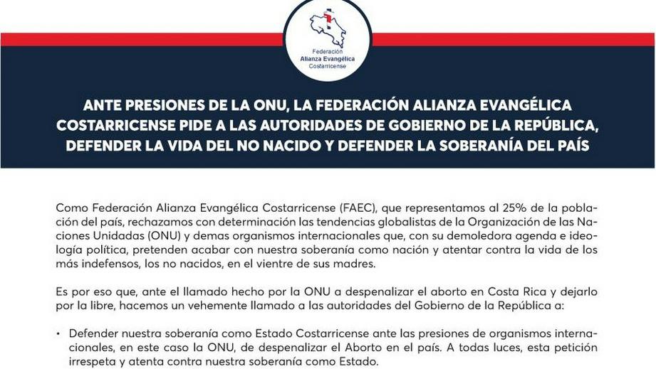 根据哥斯达黎加福音派联合会的说法,“放弃作为一个国家而屈从于联合国的压力,就是接受堕胎是一项基本人权和由此而来的所有负面影响”。