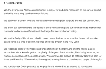 在以色列军队即将进入加沙与哈马斯作战之际,世界各地的福音联盟都在呼吁双方停火,并称耶稣的教导也是呼吁在暴力中实现和平的。