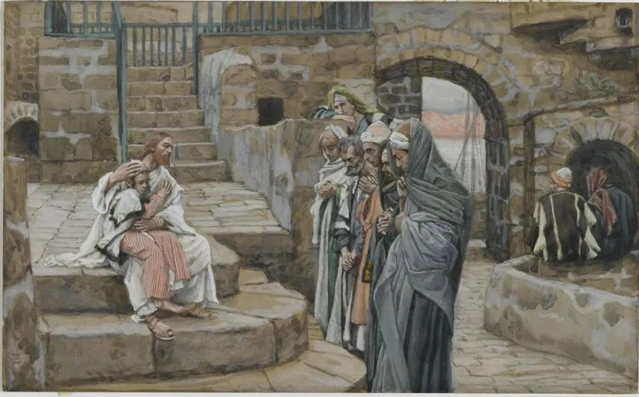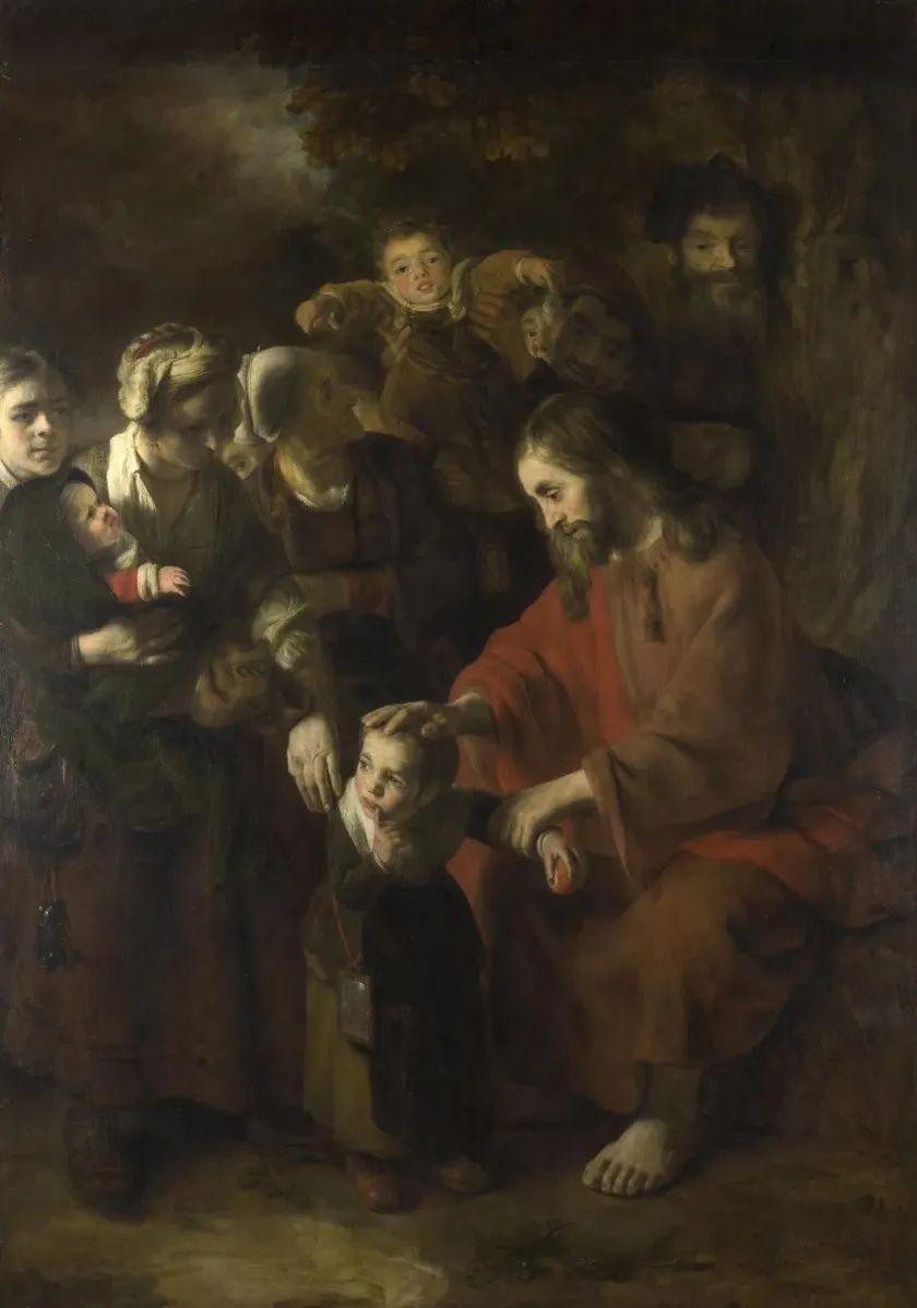 画中应该是古代罗马人的生活场景,拱顶门楼、走廊、小院。画中人物衣着比较有特色,人物表情被画家绘画得很生动。观者能感受出画中耶稣与小孩的目光,正对面一位弟子和小孩的目光,让人有种不安的感觉。他们说的什么?这是画家传神的技法的展现。也惊叹人物后面破旧的墙壁,逼真地让人以为这是一张照片。