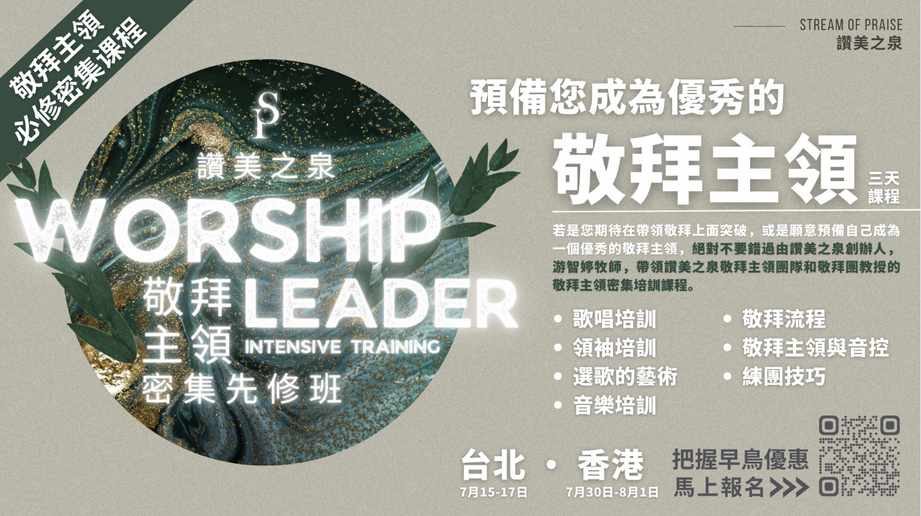 7月30日开始,在香港开设的敬拜主领密集课程,面向的是敬拜领袖或有意向成为敬拜领袖的弟兄姐妹们。课程内容包含敬拜主领的角色、歌单设计、专为敬拜主领规划的歌唱课程、敬拜带领的技巧、团队的建造、大师班,以及深入的敬拜时间。