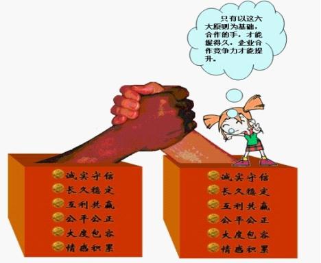 善待供应商和分销商,与其建立融洽的合作关系,不无故拖欠他们的货款,把每一个供应商和分销商都看成是合作伙伴,和他们一起成长和发展;