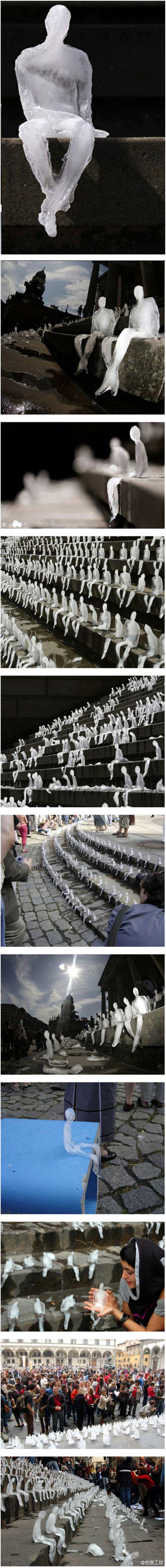 近日一组艺术微图在网络上被广泛流传,这组艺术中艺术品是用冰雕刻的人,一排排整体的被放在台阶上,然而在阳光的照射下,这些“冰人”逐渐融化,逐渐消失。这组艺术品有个标题叫:如果你明白 生命的短暂。