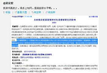 10日晚,微博@设定控在网上发布了一条微博,目前已被转发近四千次,评论六百多条。微博主要内容是一张论文截图,关于武汉大学中文系教授张思齐的论文《从咏鹅诗看基督精神对杜甫潜移默化的影响》。