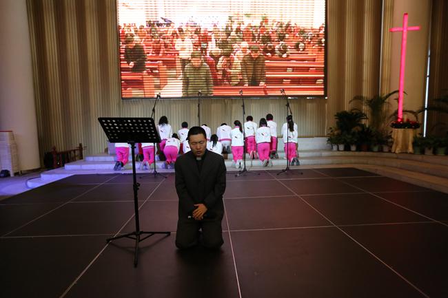 3月27日,即2016年复活节当天清晨6点,北京海淀堂主堂举办了一场晨曦祷告会。祷告会开始时,教堂里人数还不多,但不觉得冷清,摄像、灯光、摄影等义工都在忙碌着。十字架前跪着一排信徒,正在用祈祷与主沟通。