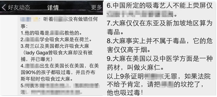除去上面笔者所随意采集到的,还有更多,数不胜数。笔者不由得想到了2014年时某位偶像明星被爆吸毒,新闻出来时其粉丝的观点主要是: