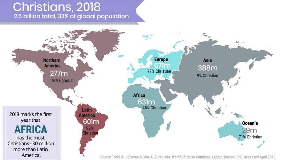 戈登-康维尔神学院全球基督教研究中心(Center for the Study of Global Christianity at Gordon-Conwell Theological Seminary)发布一份信息图表,表示目前有超过6.31亿基督徒生活在非洲,占非洲总人口的45%。