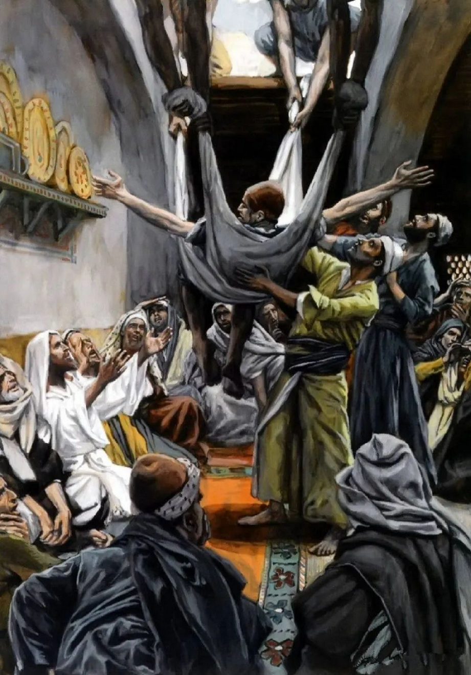 本画背景出自“治好瘫子宽赦其罪”的故事。使徒路加的记载,使我们惊异的是这个瘫子藉着朋友的信心而蒙拯救。耶稣见他们的信心──由于他们急切的信心,不计任何艰辛,把他们的朋友带到他跟前,便使瘫子得蒙救治(参路5:17-26)。