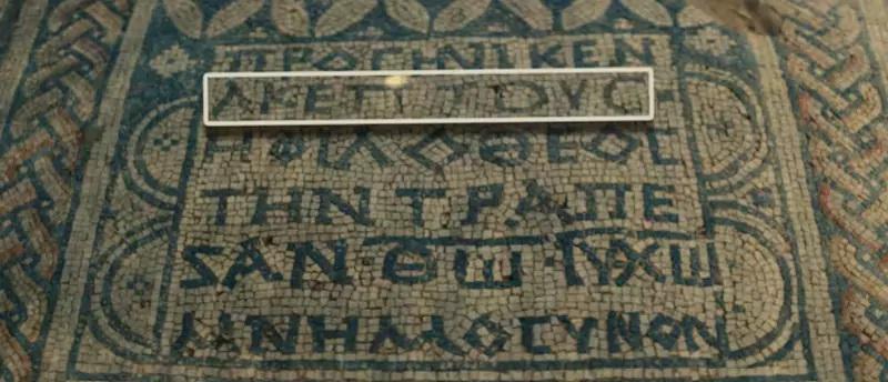 马赛克上面的铭文内容有“被神眷顾的阿克普托斯向神耶稣基督献上桌子以示缅怀”。