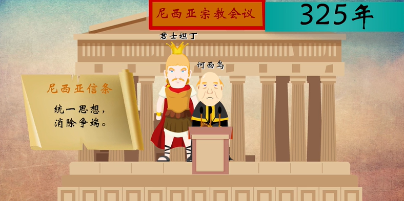 面对这种局面,君士坦丁大帝于公元325年组织东西方教会的负责人,在小城尼西亚解决亚流主义的问题。最终大家在圣灵的引导下,通过了尼西亚信经,指出“我信独一主耶稣基督,上帝的独生子,在万世以前为父所生,出于神而为神,出于光而为光,出于真神而为真神,受生,而非被造,与父一体,万物都是借着祂造的”。这确定了耶稣基督的圣子地位,三位一体的教义得以确定。